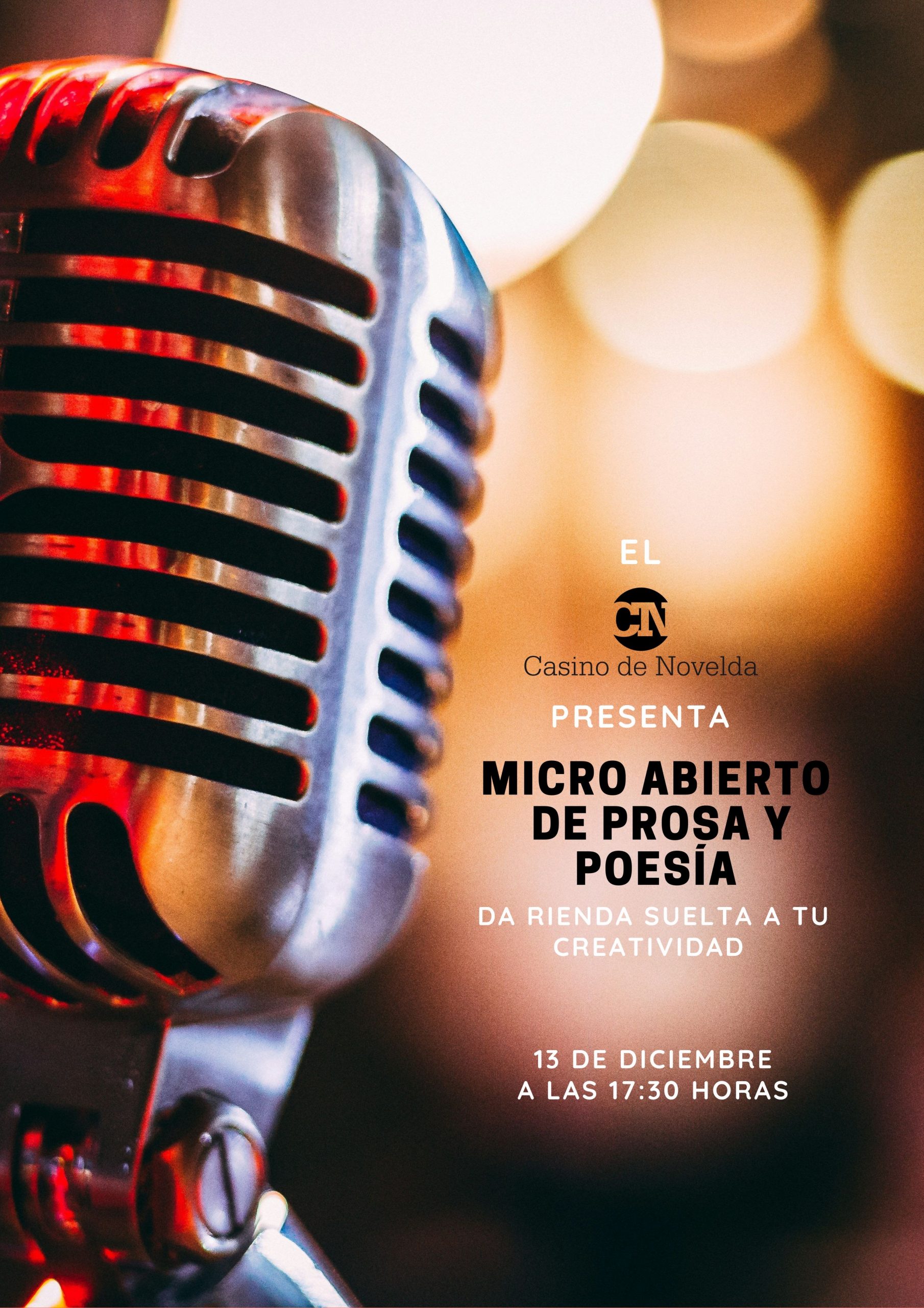Queridos amigos, el próximo 13 de diciembre, a las 17:30 horas, el Casino de Novelda les invita a un evento verdaderamente especial: un Micro Abierto de Prosa y Poesía que les hará vibrar el corazón.